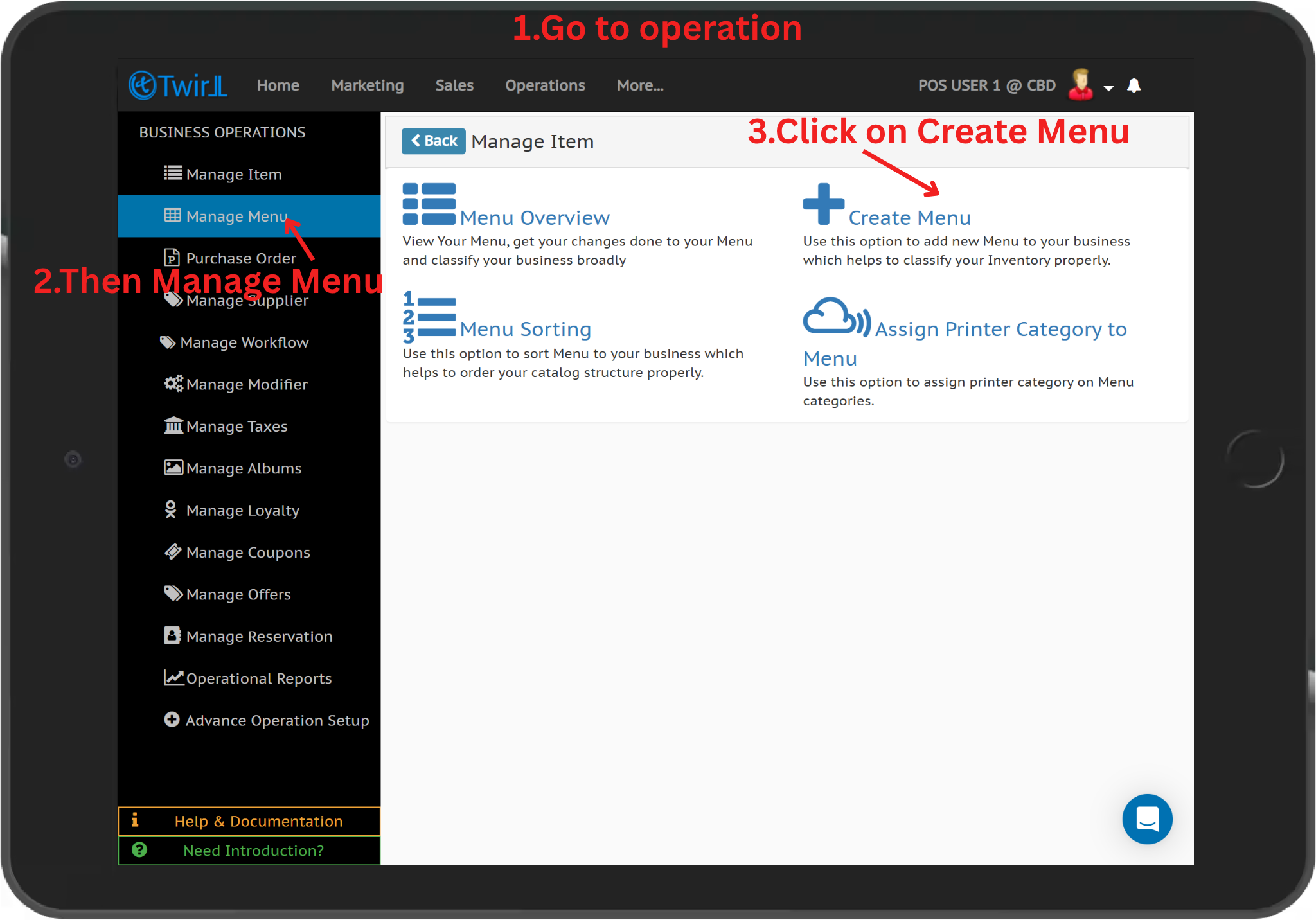 1. Logon Twirll portal. Go with operation select manage menu and then click on Create Menu.