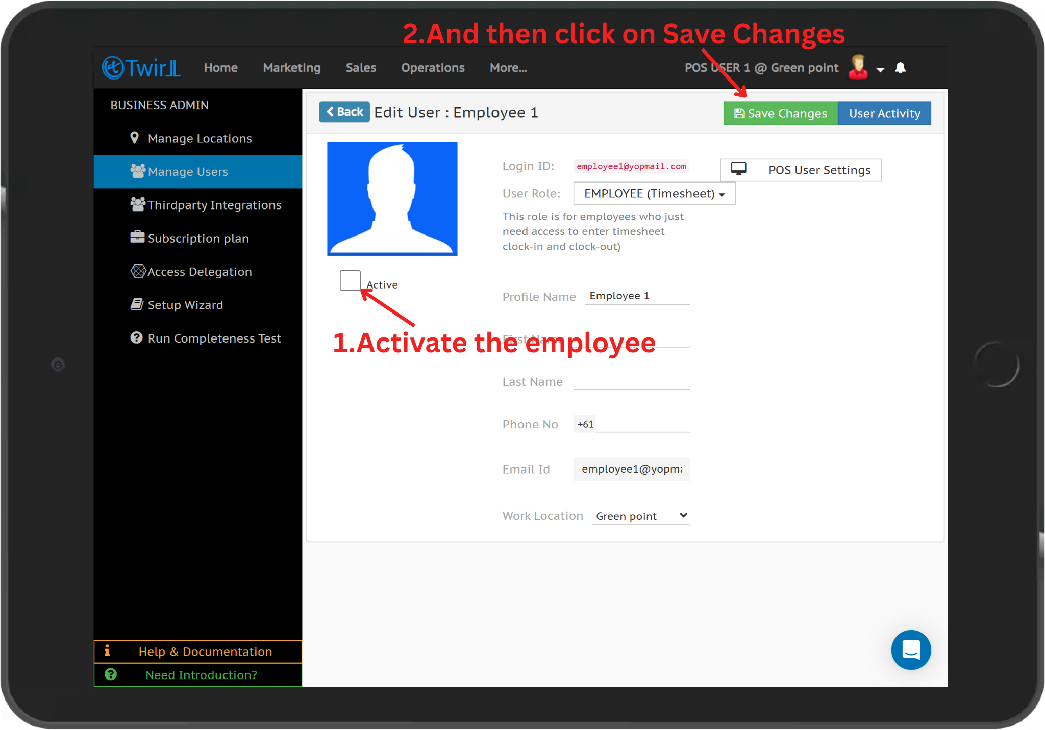 Step 4:- Enable the Active option and click on Save Changes to activate the employee.