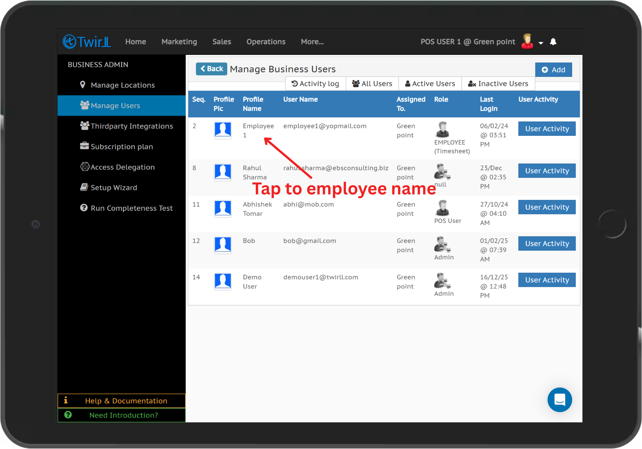 Step 1:- Log in to the Twirll Portal(portal.twirll.com). Click on “More” and select “Admin.” Then, select “Manage User.
