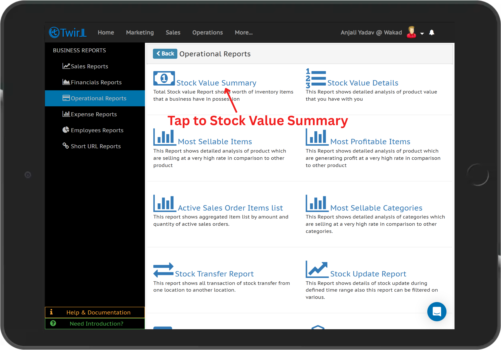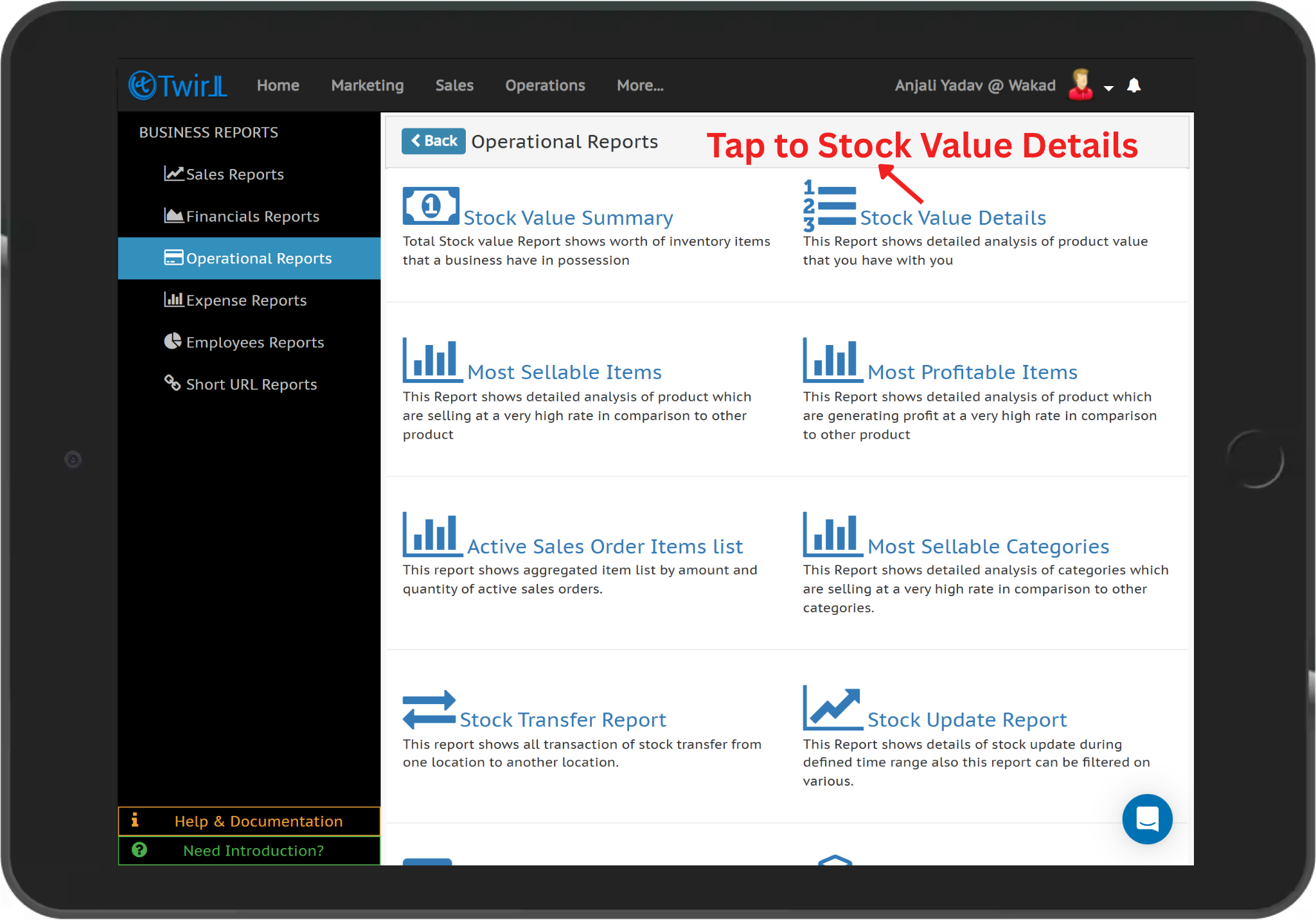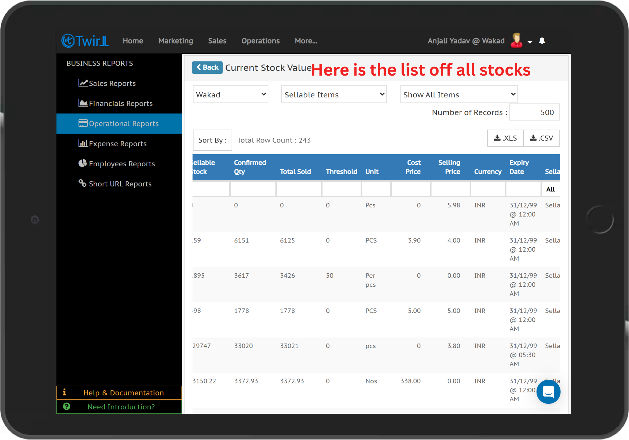 Operational report shows the details about the stock you have in your Inventory, to view your operational report follow path as