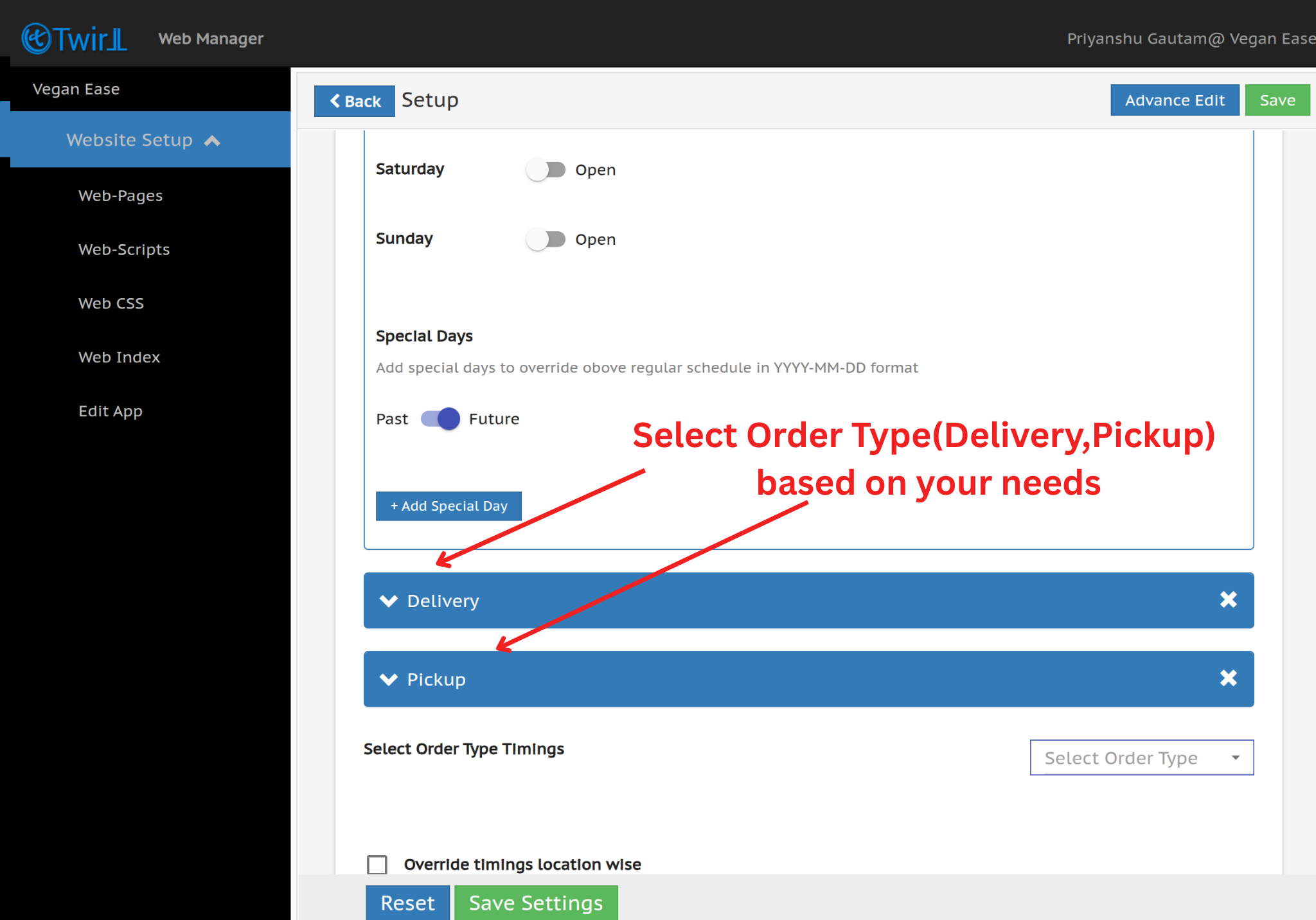 Step 2:-Slightly Scroll down the page and click on Close online ordering timings..