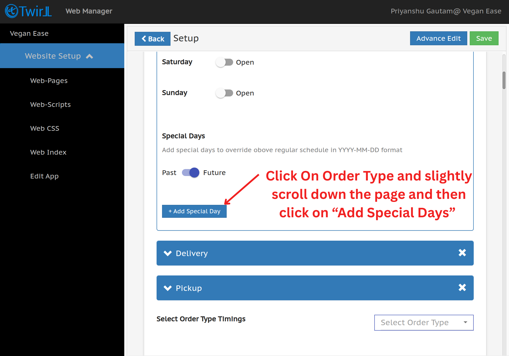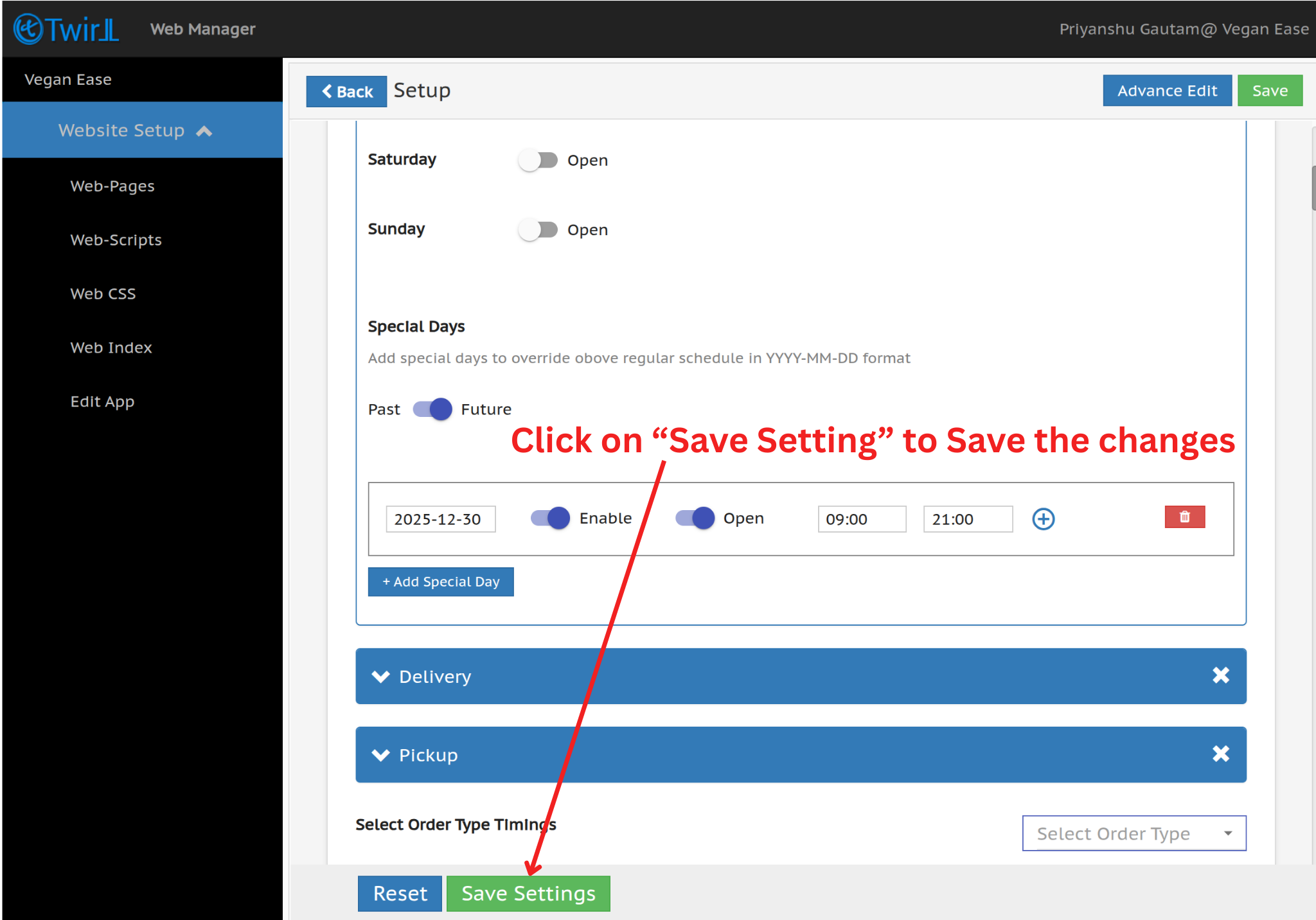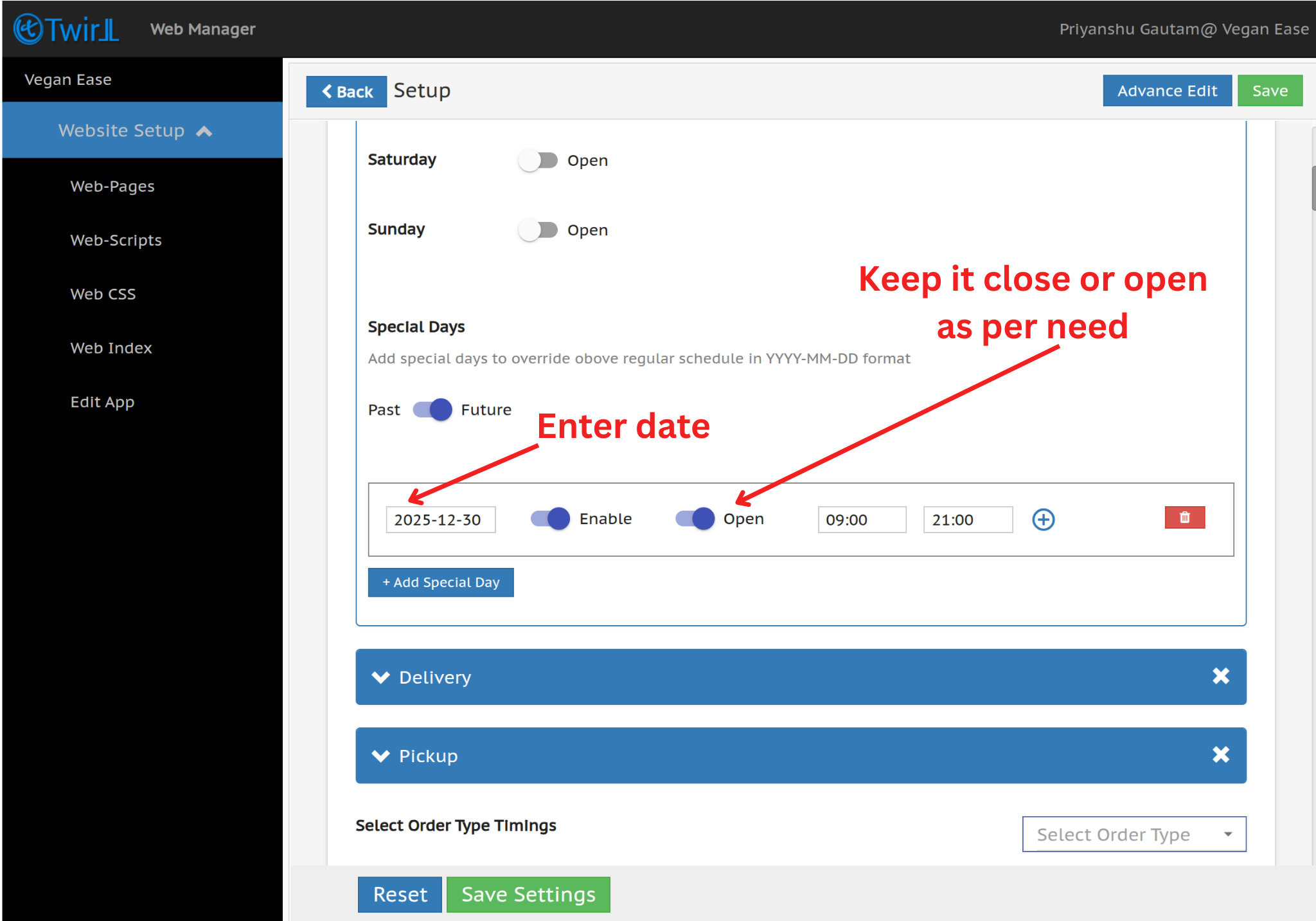 Step 4:- Click on Add special Day to configure Special Day timing.
